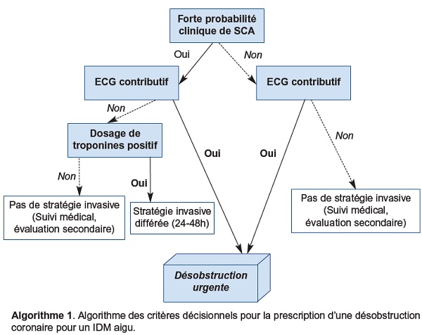 La décision de prescription d’une désobstruction coronaire pour un infarctus du myocarde (IDM) aigu repose sur une démarche de type bayesienne : l’évaluation clinique établit une probabilité initiale, réévaluée à travers la lecture de l’électrocardiogramme (ECG), permettant ainsi de choisir entre (cf. algorithme 1) :
