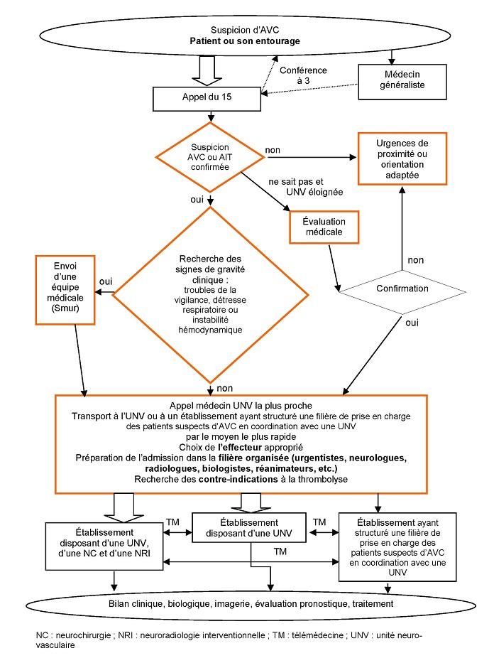 La filière intrahospitalière neuro-vasculaire doit être organisée au préalable et coordonnée avec tous les acteurs impliqués (urgentistes, neurologues, radiologues, biologistes, réanimateurs, etc.) et formalisée avec des procédures écrites. Elle doit privilégier la rapidité d'accès à l'expertise neuro-vasculaire et à l'imagerie cérébrale en organisant au mieux les aspects structurels et fonctionnels.